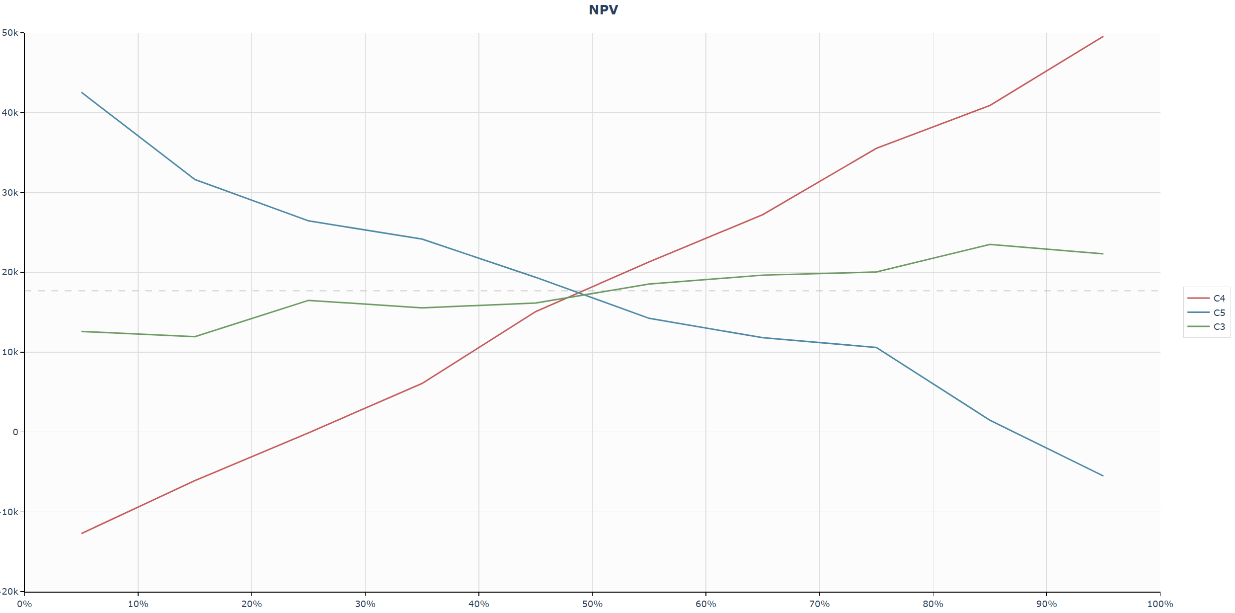 Spider Graph(蜘蛛图) 侧重“单变量变动时输出如何变化”的情景展示,与龙卷风图(条形排序)在形态和用途上均有区别,是风险分析中聚焦“变量影响力可视化”的经典工具。